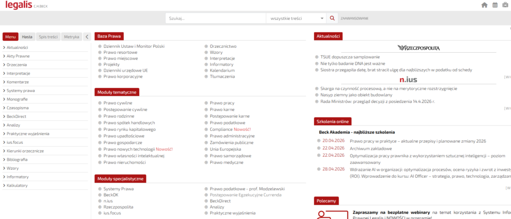 Poniżej znajduje się harmonogram szkoleń online dla użytkowników Legalis, przewidzianych na okres od 16 kwietnia do 20 sierpnia 2026 roku.